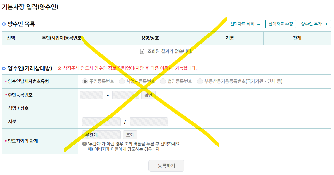 신고인 정보: 주민번호, 주소, 전화번호 입력 후 저장.★ 저장 후에 나오는 ↓ 기본사항 입력(양수인)에는 해당이 없으므로 바로 다음으로 넘어갑니다.