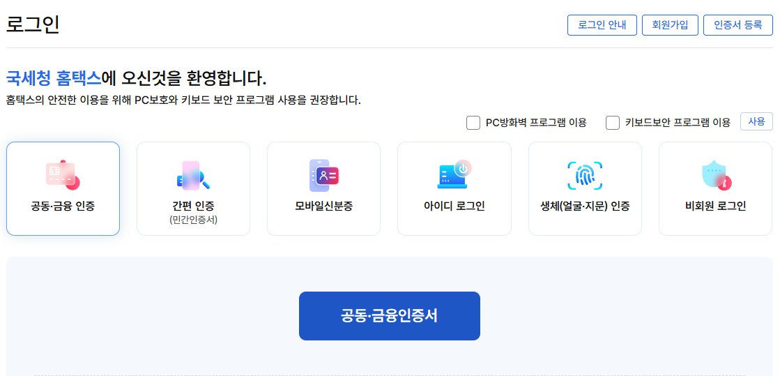 공인인증서 또는 간편 인증(카카오페이, 네이버 등)으로 로그인.